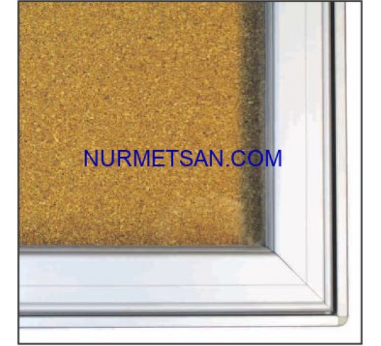 Büyük boy mantar ilan panosu, derin kasa yapısıyla gösterişli bir üründür. Temperli ESG camlar ve köşelerde kullanılan ABS rondolarla güvenliklidir.