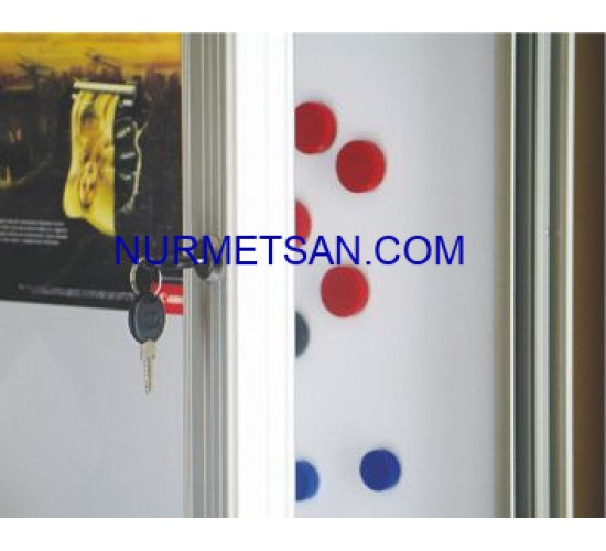 Kilitli yapısı izinsiz afiş değişimini önler. Boyutlarına göre bir ya da iki tane kilit bulundurur. Ürün kapıları menteşelidir ve 90 derece açılarak kolay görsel değişimi sağlar. Manyetik pano, ürüne dahil olan vida ve dübel setiyle iç kenarlardan monte edilmektedir.